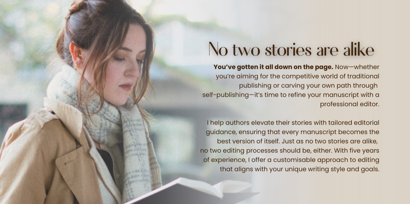 As an editor, I elevate your writing by refining its structure, enhancing its clarity and correcting its grammar while preserving your unique voice. Whether your manuscript needs meticulous proofreading, insightful developmental edits or comprehensive copy/line editing, my tailored approach ensures your story resonates with readers.